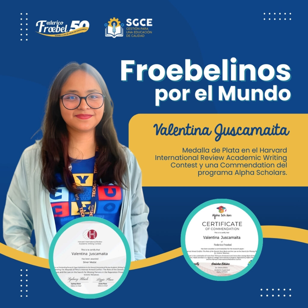 Valentina obtuvo la Medalla de Plata en el Harvard International Review Academic Writing Contest y recibió una Commendation del programa Alpha Scholars, reconocimientos que destacan la excelencia, el rigor académico y el compromiso con la investigación de alto nivel.